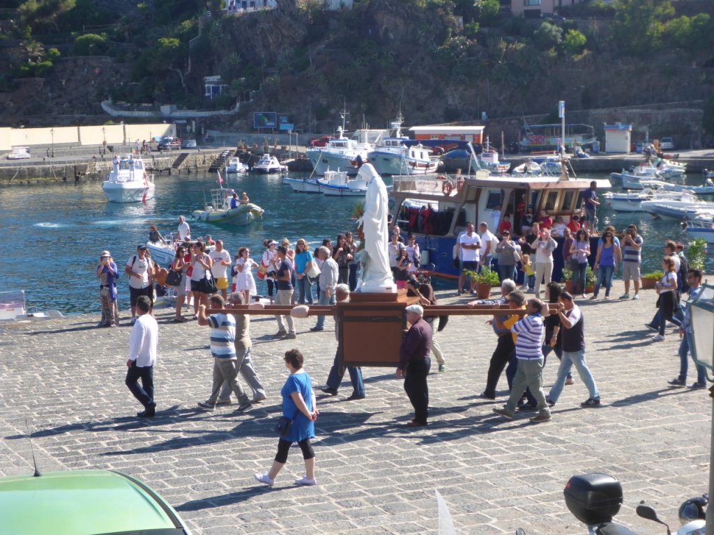 decorated and is waiting at the dock. The bearers embark the Madonna on the boat